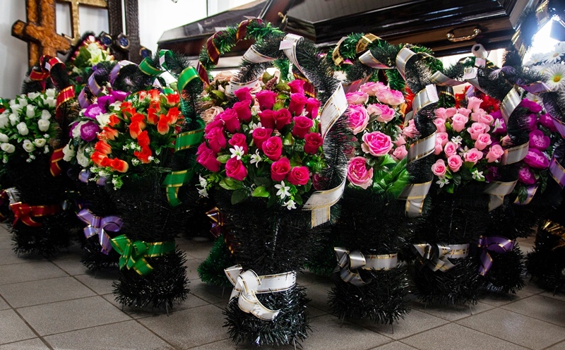 - Венки и траурные корзины. Имеются варианты различных размеров из живых и искусственных цветов.